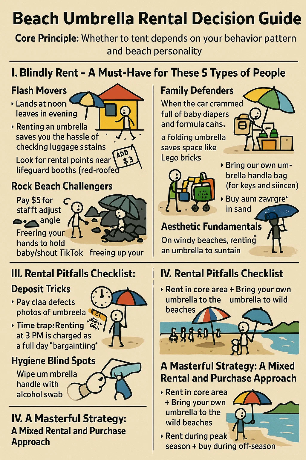 ফ্ল্যাশ মুভারস: দুপুরে ল্যান্ড করে, সন্ধ্যায় ছেড়ে যায় → একটি ছাতা ভাড়া নেওয়া আপনাকে লাগেজ চেক করার ঝামেলা বাঁচায়। লাইফগার্ড বুথের কাছাকাছি ভাড়ার পয়েন্টগুলি সন্ধান করুন (লাল-ছাদযুক্ত, হলুদ-দেয়ালের কুঁড়েঘর)। ক্ষতি রোধ করতে আপনার ফোনের কেসে ডিপোজিট স্লিপ রাখুন।