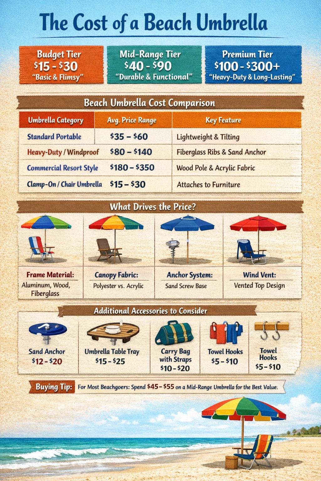 আপনি তীরে শিরোনাম করা হয়, একটি মান, নির্ভরযোগ্য সৈকত ছাতা সাধারণত $35 এবং $75 মধ্যে খরচ হয় . এই দাম বন্ধনীটি সাধারণত 6-থেকে-7-ফুট ক্যানোপি, একটি বেসিক টিল্টিং মেকানিজম এবং একটি সিলভার-কোটেড UV সুরক্ষা আস্তরণ সহ মডেলগুলিকে কভার করে। তবে বাজার বিস্তৃত; আপনি স্থানীয় বোর্ডওয়াকের দোকানে এন্ট্রি-লেভেলের "ডিসপোজেবল" ছাতা পেতে পারেন $15 থেকে $25 , যদিও উচ্চ-সম্পদ, বাণিজ্যিক-গ্রেডের শেড কাঠামো ভারী বাতাস সহ্য করার জন্য ডিজাইন করা হয়েছে $150 থেকে $300 বা তার বেশি .