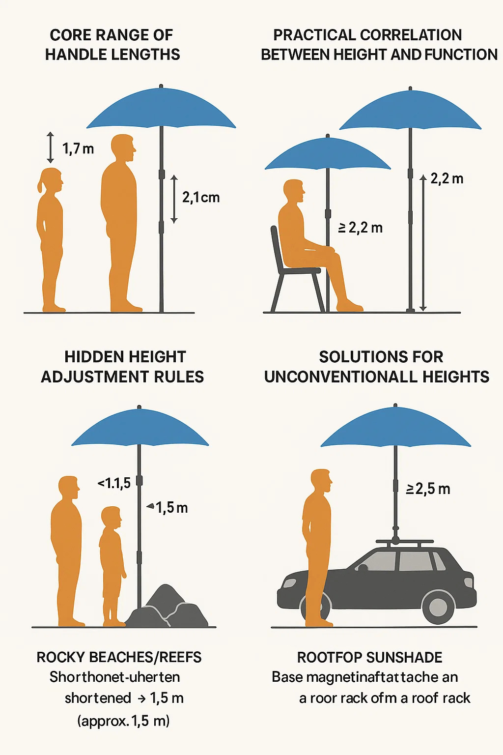 নিম্নলিখিতগুলির একটি ব্যবহারিক বিশ্লেষণ সৈকত ছাতা সাধারণ ব্যবহারের পরিস্থিতি এবং এরগোনমিক ডিজাইনের নীতিগুলির উপর ভিত্তি করে উচ্চতা: