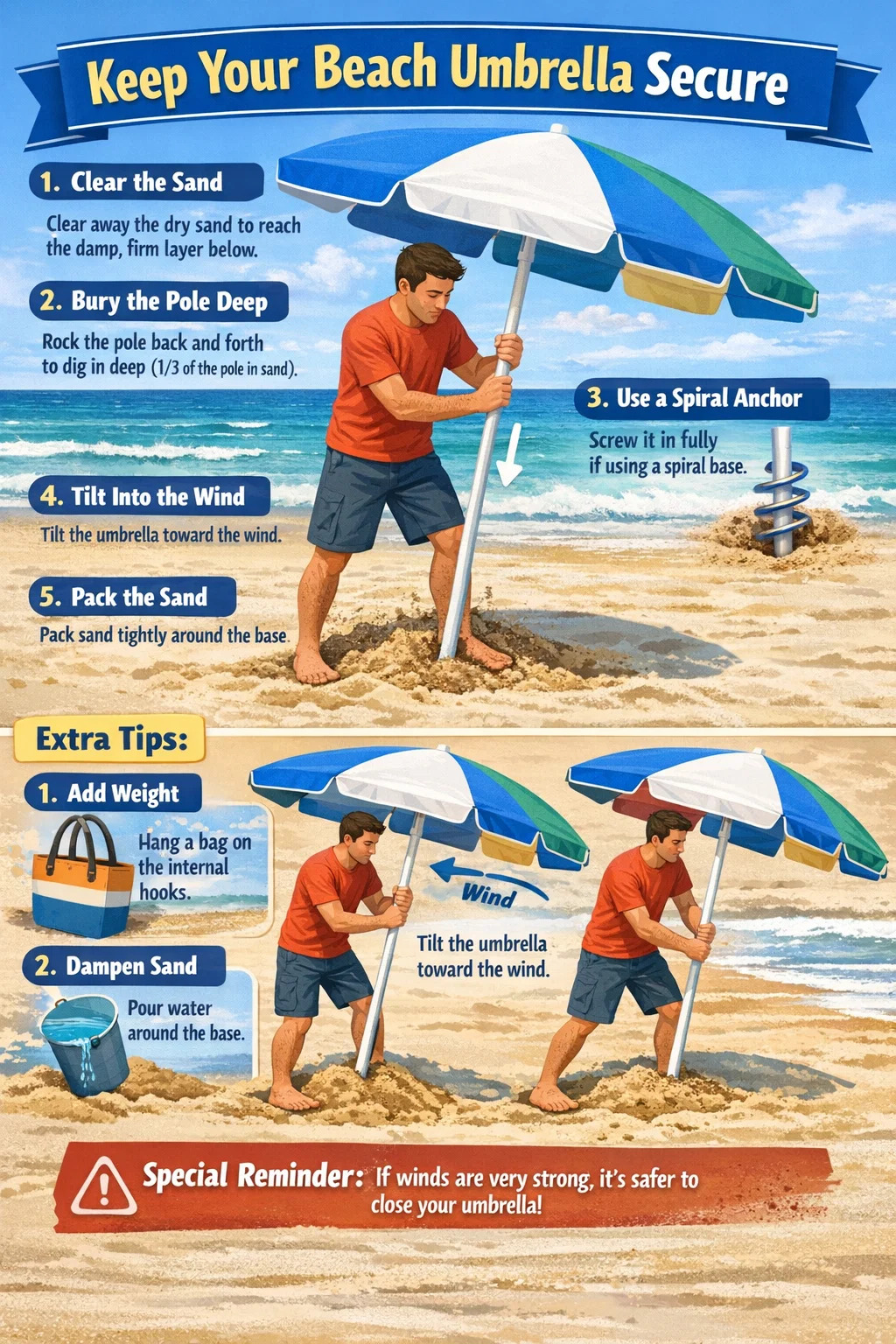 এটিকে কেবল সোজা নীচে ঠেলে দেবেন না: অনেক লোক সহজভাবে নীচে ধাক্কা দেয়, তবে এটি এটিকে যথেষ্ট গভীরে কবর দেয় না। সর্বোত্তম উপায় হল ছাতার খুঁটিটি ধরে রাখা, দৃঢ়ভাবে নিচে চাপানো, এবং এটিকে সামনে পিছনে জোরে জোরে রক করা, মেরুটিকে একটি ড্রিল বিটের মতো বালিতে "ড্রিল" করার অনুমতি দেয়।