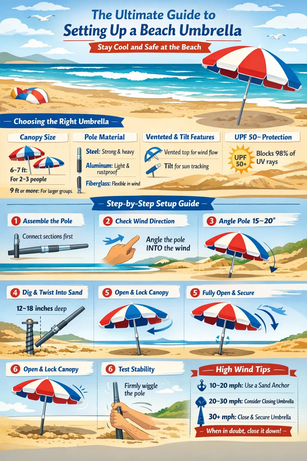 এই নির্দেশিকাটি বিস্তারিতভাবে প্রতিটি ধাপ কভার করে — সঠিক সৈকত ছাতা বাছাই থেকে শুরু করে 20 মাইল প্রতি ঘণ্টার বেশি ঝোড়ো হাওয়ায় স্থিতিশীল রাখা পর্যন্ত — যাতে আপনি সরঞ্জামের সাথে কুস্তিতে কম সময় এবং জল উপভোগ করতে বেশি সময় ব্যয় করতে পারেন৷