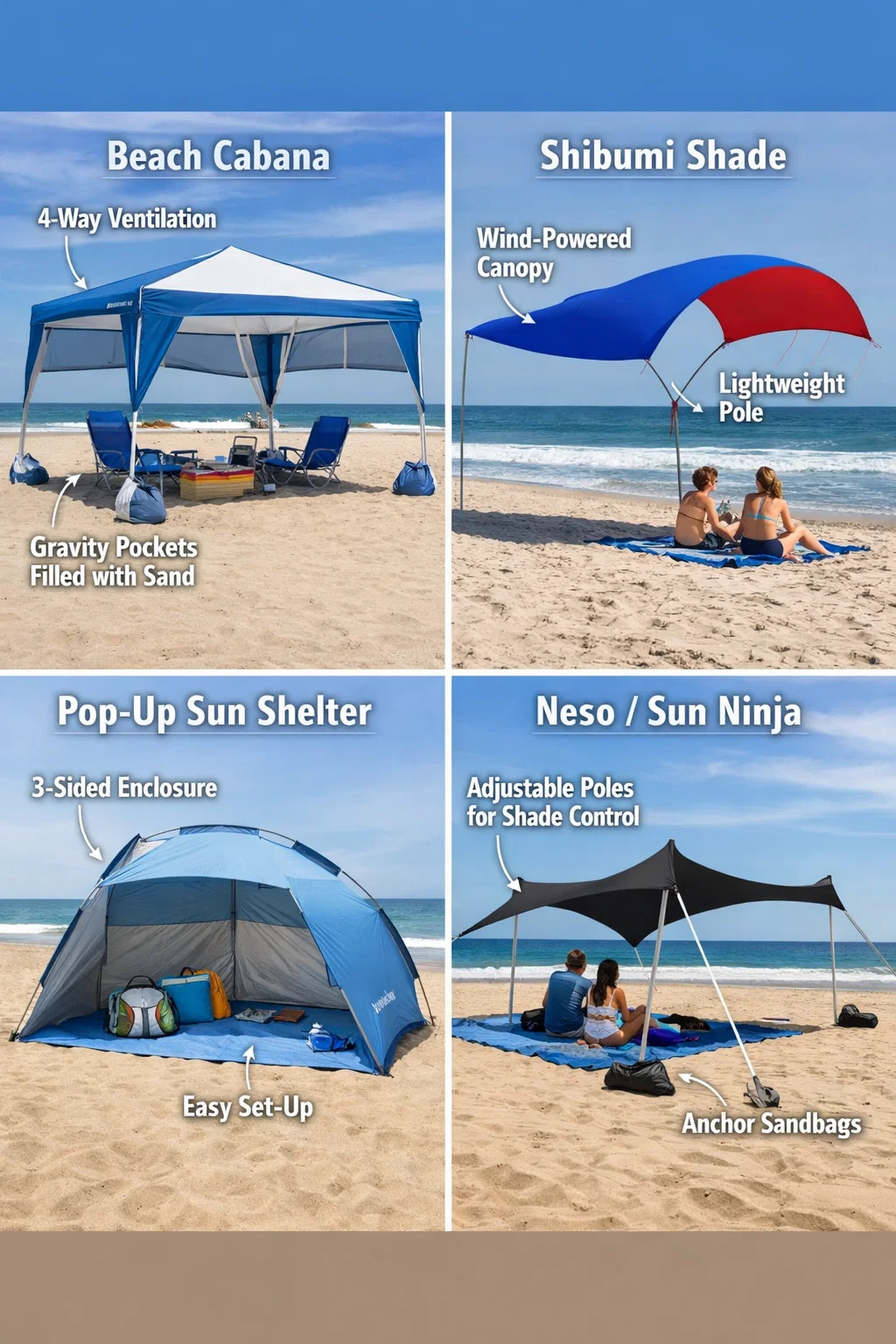 যখন সৈকত ছাতা ক্লাসিক, আপনি যদি আরও স্থিতিশীল, প্রশস্ত বা আধুনিক সূর্য সুরক্ষার অভিজ্ঞতা খুঁজছেন, নিম্নলিখিত বিকল্পগুলি বিভিন্ন উপায়ে উচ্চতর সুরক্ষা প্রদান করে: