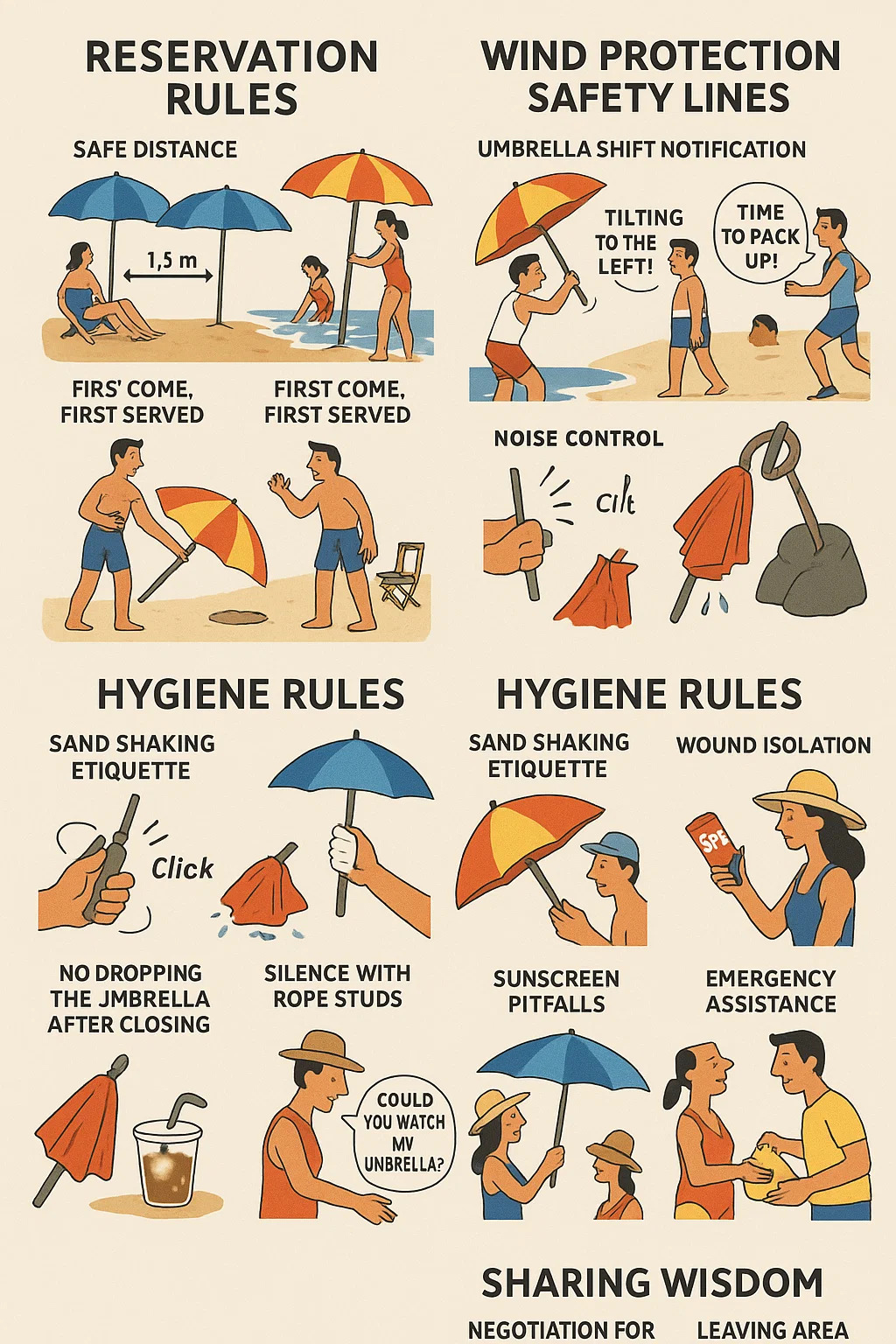 নিরাপদ দূরত্ব: আপনার প্রতিবেশীর ছাতা থেকে দুটি বিচ চেয়ারের প্রস্থ (প্রায় 1.5 মিটার) দূরত্ব বজায় রাখুন। যদি আপনার ছাতার ছায়া অন্য ব্যক্তির এলাকা থেকে বিচ্যুত হয়, ক্ষমাপ্রার্থী এবং সেই অনুযায়ী সামঞ্জস্য করুন।