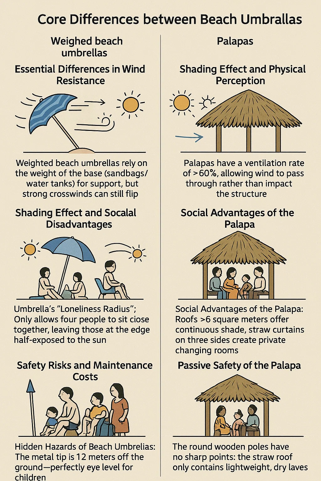 সৈকত ছাতা সূর্য সুরক্ষা সীমাবদ্ধতা: ছাতার নীচে ছায়া সূর্যের কোণে স্থানান্তরিত হয়, ঘন ঘন সামঞ্জস্য প্রয়োজন। রৌপ্য আবরণটি অকার্যকরভাবে স্থল থেকে তাপ বিকিরণকে প্রতিফলিত করে, তাই এমনকি দুপুরে যখন বালির পৃষ্ঠটি 60 ডিগ্রি সেন্টিগ্রেড হয়, ছাতার নীচে তাপমাত্রা এখনও 40 ডিগ্রি সেন্টিগ্রেডের বেশি হতে পারে। পালাপাস প্রাকৃতিক কুলিং অফার করে: ঘন পাম পাম ফ্রন্ডগুলি এটি প্রতিফলিত করার পরিবর্তে তাপকে শোষণ করে, একটি ধ্রুবক আর্দ্রতা স্তর বজায় রাখে (সৈকতে পরিমাপ করা হয়, ছাতার নীচে থেকে 3-5 ডিগ্রি সেন্টিগ্রেড কম); সম্পূর্ণ সানশেডের কোনও সামঞ্জস্য প্রয়োজন।