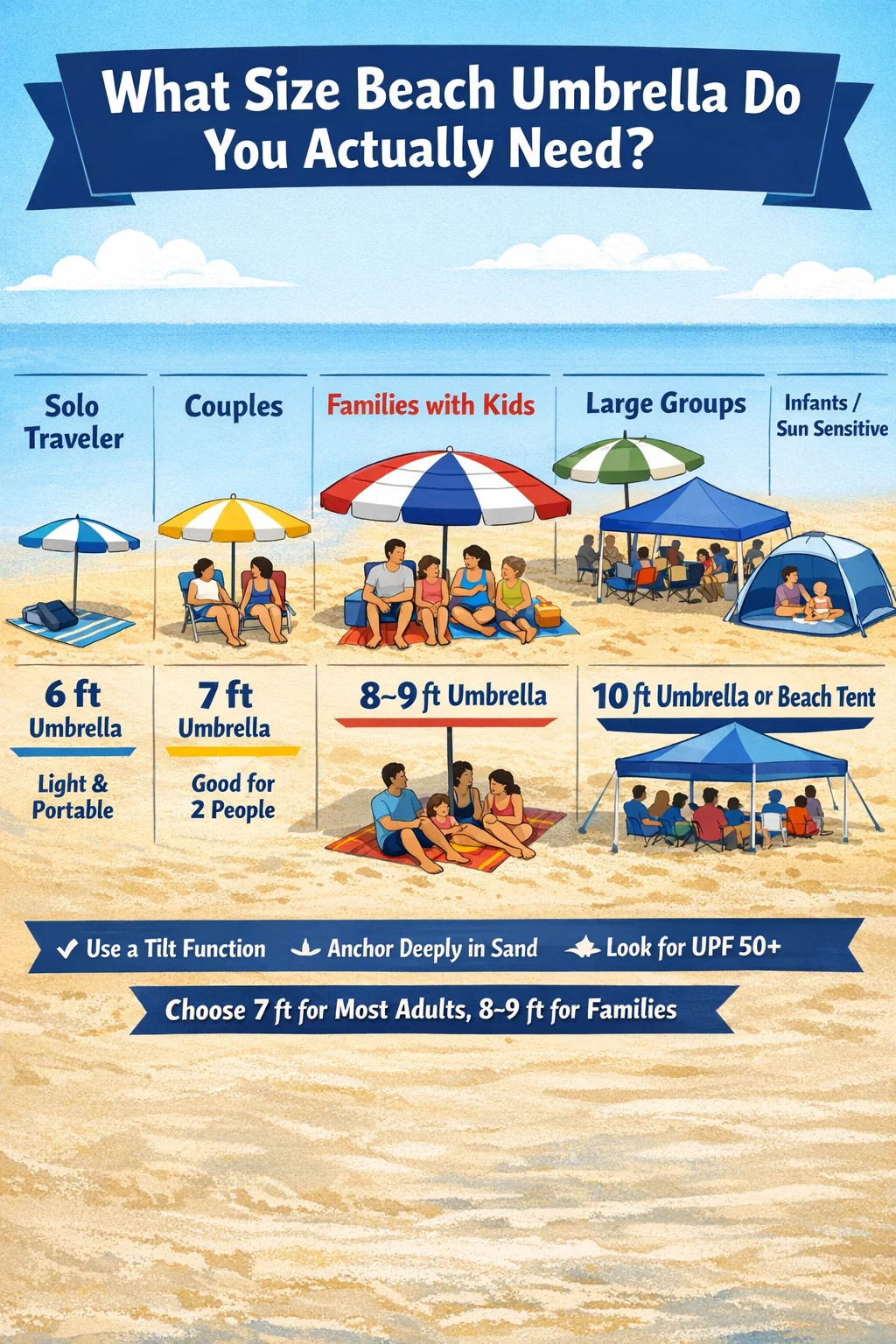 The right beach umbrella size is the one that actually fits your group, your beach, and your carrying capacity — not the largest one that technically exists. For the vast majority of people, a 7-foot beach umbrella with a tilt mechanism and UPF 50+ canopy is the single best all-around choice. Go up to 8 or 9 feet for families, and down to 6 feet if you're traveling light and going solo. Whatever size you choose, anchor it properly, tilt it toward the sun, and you'll get far more out of it than most people do.