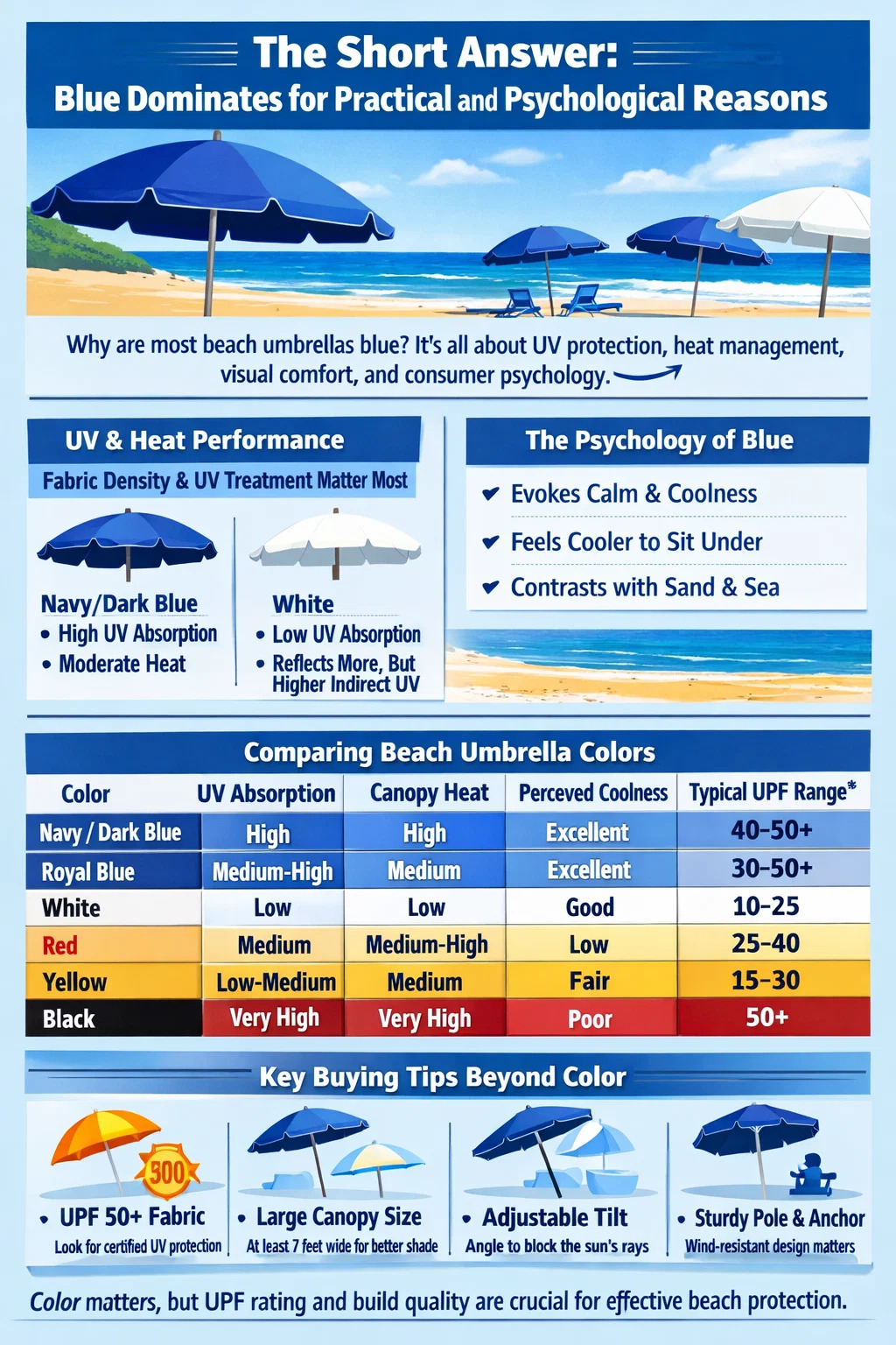 টেবিলটি ব্যাখ্যা করে যে কেন নীল একটি মিষ্টি জায়গায় বসে: এটি কালো রঙের মনস্তাত্ত্বিক এবং তাপীয় ডাউনসাইডগুলি ছাড়াই শক্তিশালী ইউভি শোষণের প্রস্তাব দেয় এবং এটি শীতলতার একটি উপলব্ধি প্রদান করে যে লাল বা হলুদ উভয়ই সমুদ্র সৈকতে মিলতে পারে না।